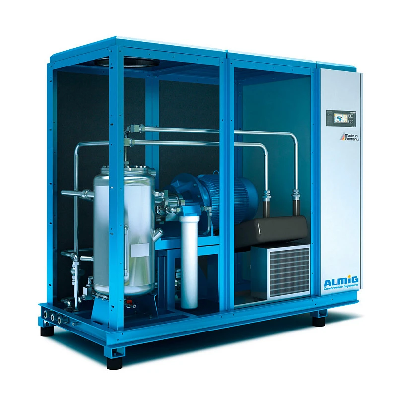 Винтовые компрессоры серии LENTO – это 100% безмасляный и очищенный от механических примесей сжатый воздух, соответствующий классу «0» по маслу, в соответствии с ISO 8573–1:2010. Процесс сжатия сопровождается впрыскиванием воды в винтовой блок. При этом нет необходимости подводить к компрессору внешний источник жидкости, соответствующей технологическим требованиям. Компрессоры LENTO сами обеспечивают себя водой. Постоянное восполнение и обновление воды в компрессоре LENTO происходит благодаря конденсату, который образуется в процессе охлаждения сжатого воздуха во встроенном рефрижераторном осушителе. Во время первичной установки компрессор наполняется обычной водопроводной водой, а в дальнейшем непрерывно генерирует собственную пресную воду. Интегрированная технология SCD, разработанная ALMiG, в режиме частичных нагрузок при переменном потреблении сжатого воздуха позволяет достичь экономии электроэнергии до 35%.